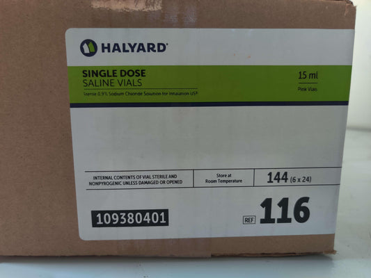 Case of 144 Halyard Sinlge Dose 15ml Saline Vials 109380401 116