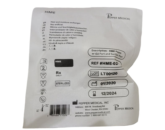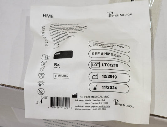 Pepper Medical HME Heat and Moisture Exchanger with O2 Port and Paper Filter 50/Case HME-02P - New
