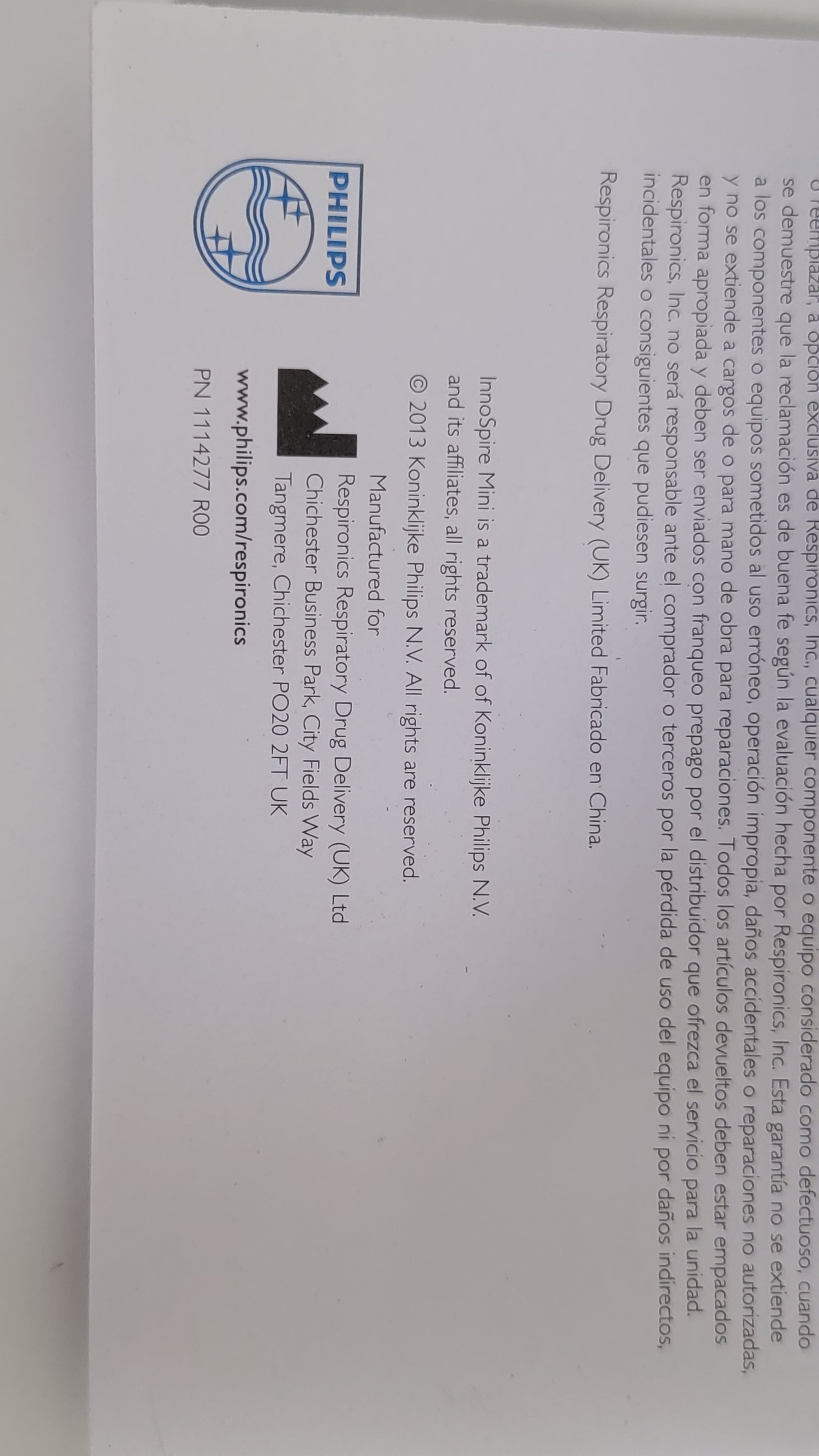 • Philips Respironics Innospire Mini Instruction Booklet MPN 1114277