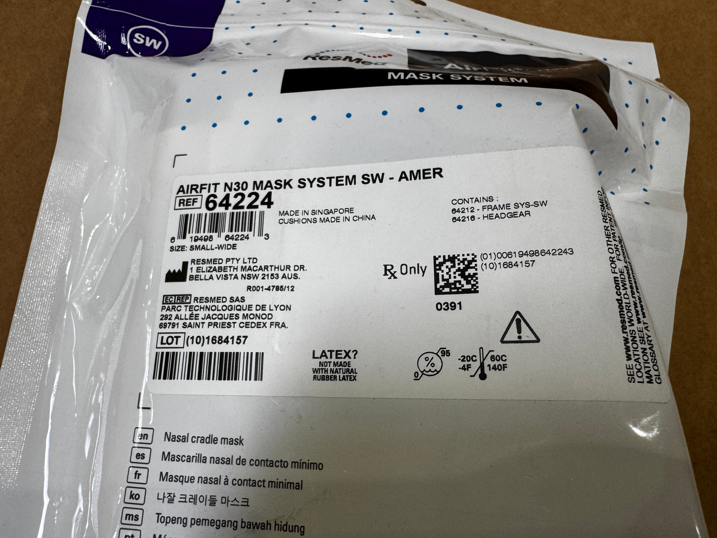 ResMed AirFit Model N30 CPAP Nasal Mask System with Headgear SW MPN 64224 - New