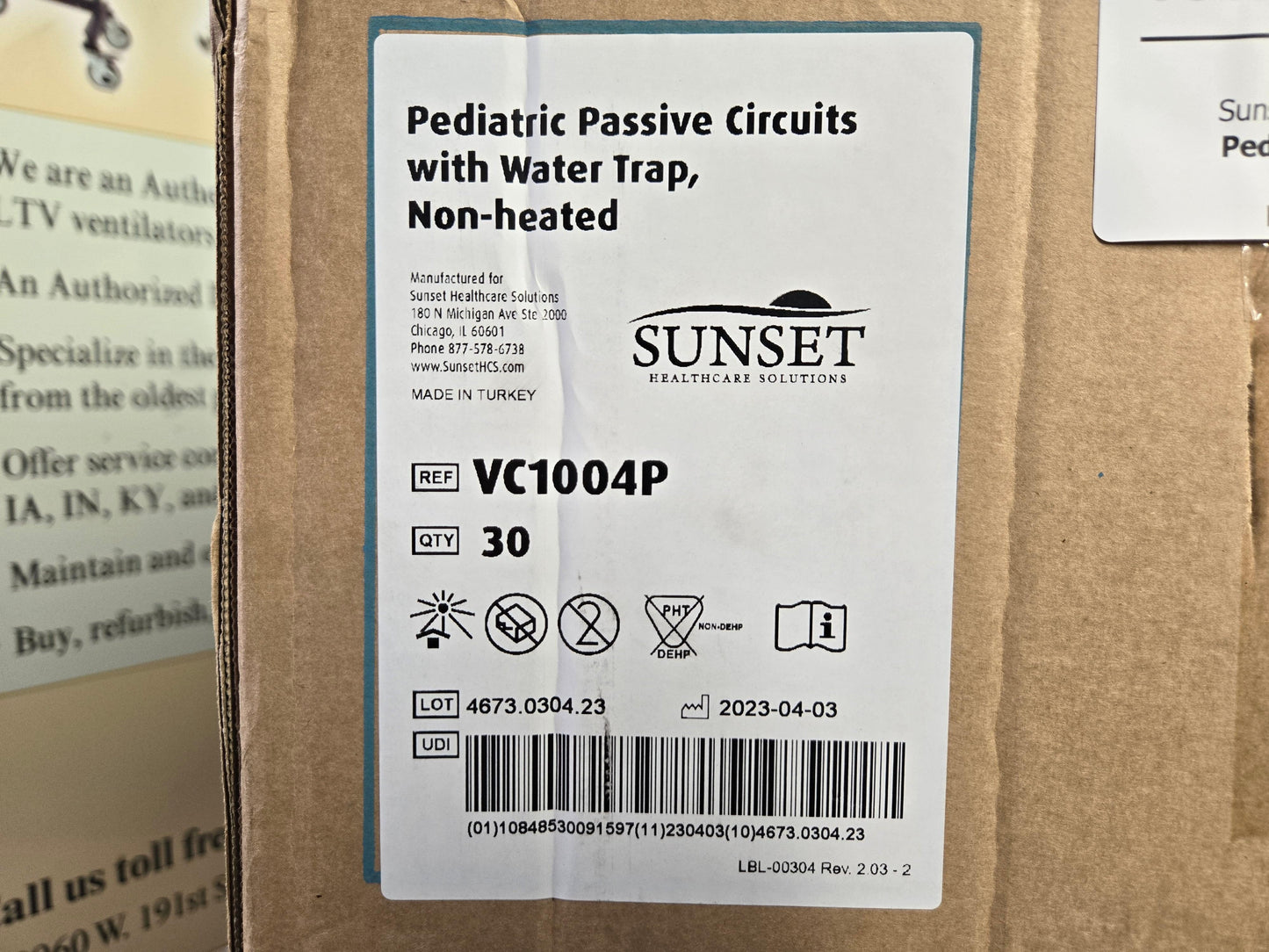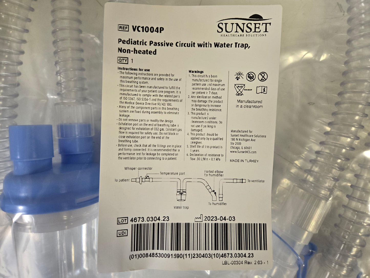 - NEW 30 per case Sunset Healthcare Solutions Pediatric Passive Circuit With Water Trap MFG PN VC1004P Ventilator Circuit, Non-heated . Substitute for Philips Respironics Disposable Pediatric Passive circuit with water trap Ref PN 1073224 Other Ref PN 1074614 Each , 1073233 20PK