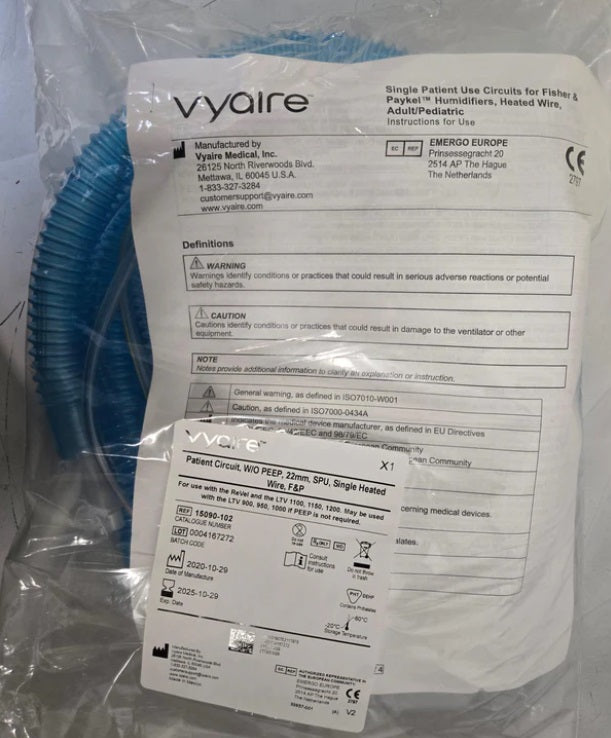 - Vyaire Heated Patient Circuit W/O PEEP, 22mm, SPU, Single Heated Wire, F & P MPN 15090-102 - New